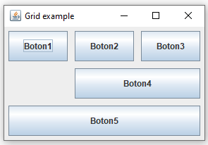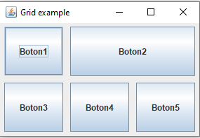 Despues para introducir los componentes en el contendor tenemos que definir las propiedades que tendrá el elemento dentro del grid, lo hacemos de la siguiente manera usando un GridBagConstraints (en el siguiente código introducimos 3 botones):